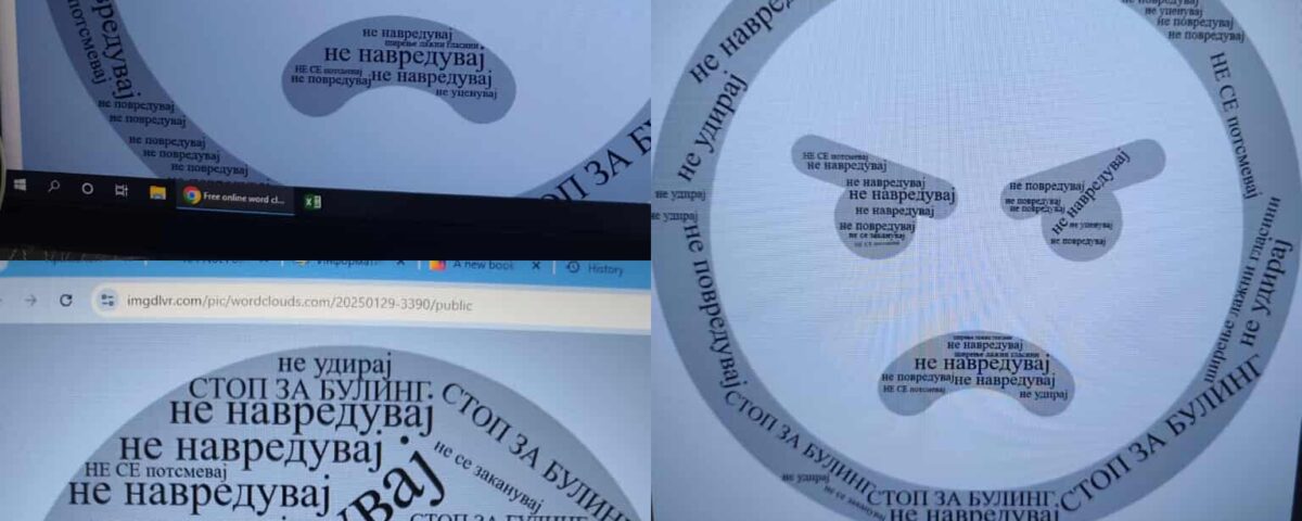Учениците изработија креативно лого со зборови со силна порака „Против насилство“ користејќи ја апликацијата Word Cloud. Преку оваа активност тие размислуваа за значењето на почитта, другарството, толеранцијата и пријателството, претворајќи ги позитивните вредности во визуелна порака.